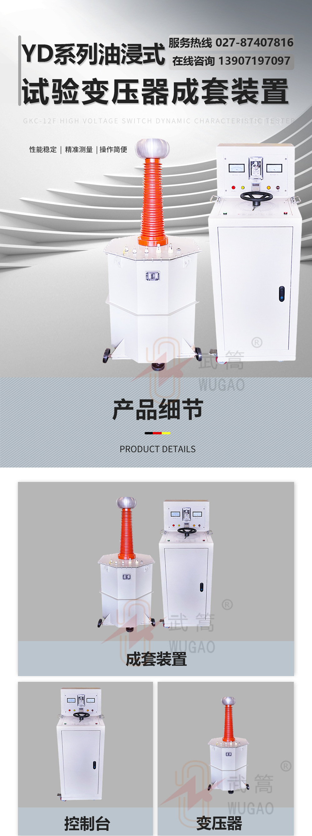 注:本系列產(chǎn)品中有200V的串級抽頭,可二臺或三臺串級成交流100KV、150KV、200KV、300KV直流140KV、210KV、280KV、420KV的高電壓。
